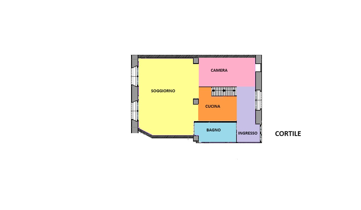 Spazioso e luminoso soggiorno con un altezza di mt 3,70, cucina con induzione semi abitabile, camera da letto, bagno con doccia ed areazione forzata, pratico e spazioso ripostiglio. Posto bici/moto in cortile.